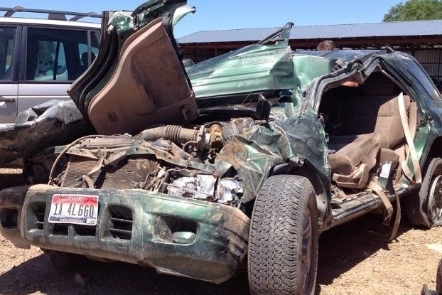 Boom, all of a sudden the vehicle jerks violently and the sound of a horrible noise. My driver side rear tire blew out. Suddenly It’s all I can do to control the vehicle and the next thing I know, I can’t. Now we are facing the semi I just passed. We are practically going backwards down the freeway at 75 miles an hour. We hit the dirt shoulder and the vehicle violently started rolling before finally coming to rest on its wheels. My brothers and sister-in-law watching everything happen… Wishing, wanting, and praying it was not true. After the dust settles they all start to panic and run up to us. I remember my brother saying Cody Cody are you okay? I had broken my neck. I remember telling him I can’t move my arms or legs I need you to get me out of here it’s going to catch fire. I was in fear that my hot exhaust pipe would set the dry desert vegetation on fire and we would burn as I knew we came to rest back on the tires.